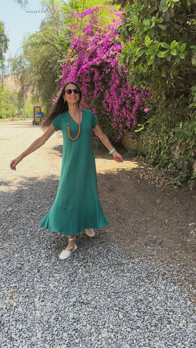 El Vestido Luisa está confeccionado en algodón fresco y liviano, ideal para los días cálidos. Su diseño largo con suave vuelo inferior entrega una caída hermosa que estiliza y acompaña el movimiento con naturalidad.